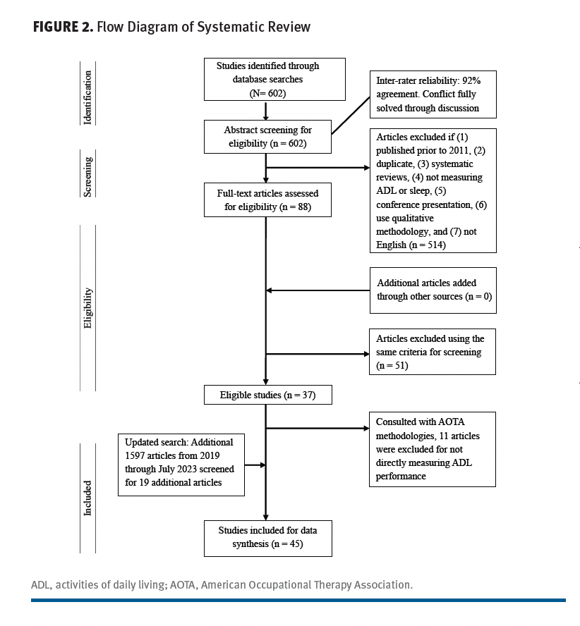 During an early review of the articles, an additional inclusion criterion was selected. Only articles with clearly reported ADL or sleep outcomes were kept. Studies using only assessments of quality of life that contained just 1 or 2 items pertaining to ADL performance were excluded. Studies only evaluating the severity of fatigue were also excluded, as they did not directly measure ADL or sleep outcomes.