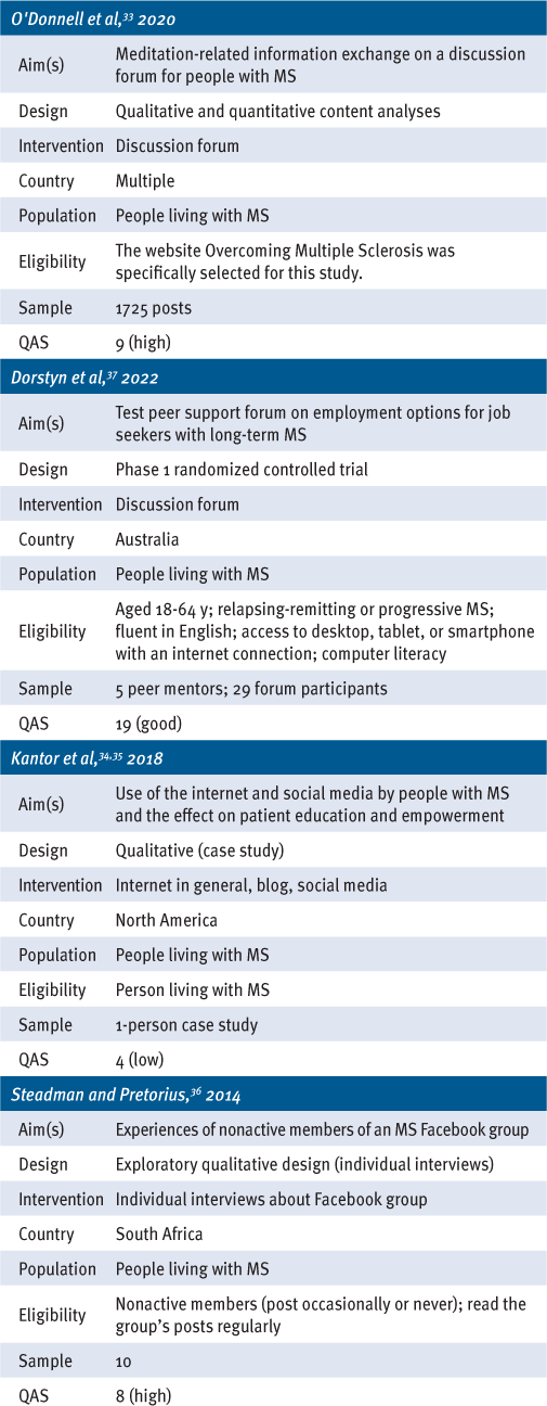 A systematic database search was conducted in April 2020. The search was rerun in May 2022. The primary reviewer (E.V.G.) took the lead in developing the search strategy with the help of 2 librarians and another author (N.C.), who is an academic expert on online peer support. The initial search was part of a wider appraisal of the literature and included online peer support for people living with MS, Parkinson disease, amyotrophic lateral sclerosis, and Huntington disease. Six databases were searched: Cumulative Index to Nursing and Allied Health Literature, Cochrane Library, Embase Medline, PsycINFO, Scopus, and Web of Science. The keywords used for the searches are presented in TABLE S1, available online at IJMSC.org. One search filter regarding year of publication (ie, 1989–2020) was applied.23 When rerunning the search, the filter was adjusted to the years 2020 to 2022. No filters were used for study design. Finally, the reference lists of the included papers were searched manually.