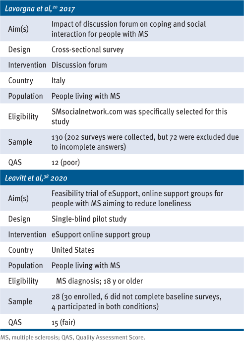 Online peer support can be provided via a variety of online platforms, including text-based and verbal communication; however, the systematic database search identified only 1 study38 focusing on verbal communication. In addition, only 2 studies discussed potential barriers and challenges.34–36 Therefore, this review may overrepresent the positives of online peer support and not provide enough insights into potential negatives. This is a common limitation of research into online peer support.42 Finally, physical symptoms associated with MS may limit access to online peer support. Although 1 study mentioned this issue,36 this review does not include the perspectives of those who cannot or do not want to use online peer support.