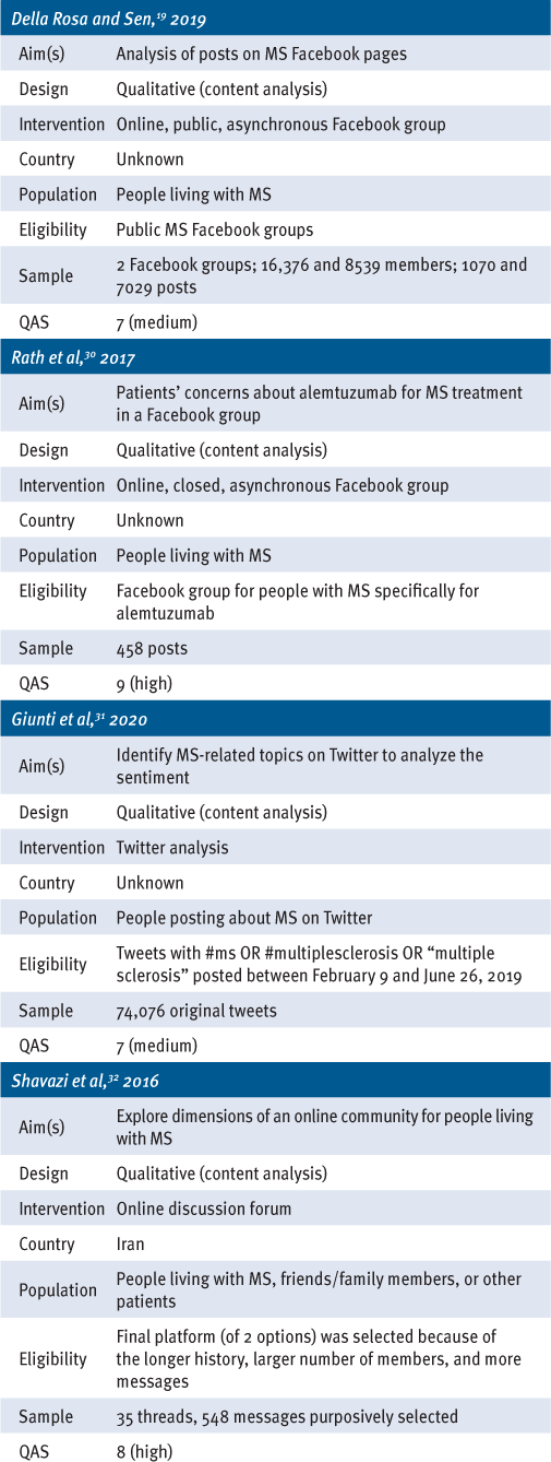 All but 1 study included text-based, asynchronous (not in real time) communication. In the study by Leavitt et al,38 participants communicated verbally in real time. The online peer support communities analyzed by Della Rosa and Sen,19 Rath et al,30 Dorstyn et al,37 O’Donnell et al,33 Steadman and Pretorius,36 Lavorgna et al,20 and Leavitt et al38 were moderated: 1 or multiple people monitored the group and the posts being shared or guided the discussion. In the studies by Kantor et al,34,35 participants spoke about online peer support in general rather than a specific platform, and, thus, moderation was not discussed. Whether the platform was moderated in the study by Shavazi et al32 is unknown. Shavazi et al32 included family members and friends, whereas the other studies included only people with MS. A fuller description of the interventions is provided in Table 1.