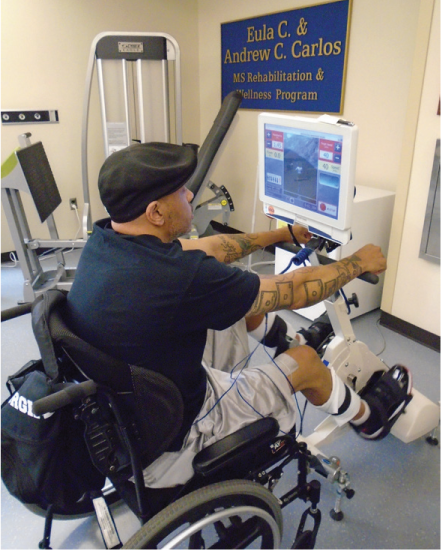 Functional electrical stimulation cycling may be a viable and effective exercise option for people with moderate-to-severe MS. Further study is required to examine the parameters of FES cycling that are most effective for people with different MS symptoms and to fully explore the potential benefits of optimizing function and improving health in people with MS.