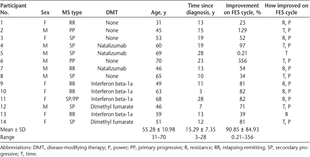 Although promising, findings from this study should be viewed with some caution given the small number of participants and the lack of a control group. Furthermore, given the nature of the study, we had to choose a protocol that may or may not have been the most beneficial for all people in the study. A different method of delivery, that is, frequency and duration of training, may have yielded different results. Given that the FES cycle defaults to start with 0.5 Nm of resistance, we are not truly clear about each participant's starting capacity. Because the study was only 4 weeks in duration, we also do not know participants' full potential for change. Further study is required to explore the efficacy of this protocol in more individuals with moderate-to-severe MS and to compare this with other potentially effective protocols. We also did not have a measure of function. Although participants reported that they experienced increased ease with transfers and household ambulation, we did not objectively collect or measure these changes. The fact that there were improvements in the speed and quality of walking in the study by Ratchford et al.19 suggests that including functional outcome measures may be beneficial for future studies to determine the effect of FES cycling on function in people with moderate-to-severe MS. Finally, although we collected information related to the disease-modifying therapies that the participants were using, the type of MS they had, their age, sex, and time since diagnosis, we did not control for these variables and did not have enough participants to evaluate whether they affected performance in this protocol. Future studies should explore the effect of these variables, as well as other medications, on FES cycle training.