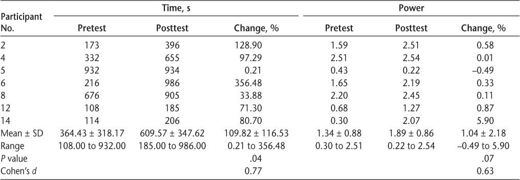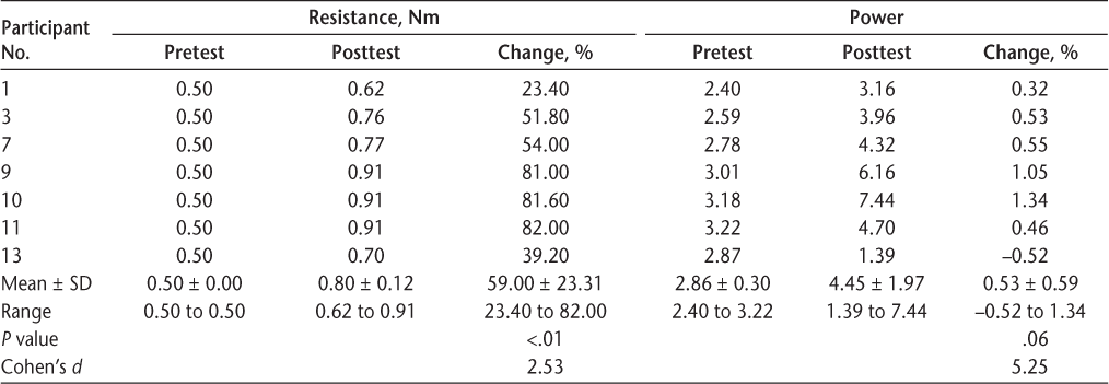 The other half of the group (n = 7) could actively cycle 30 minutes by the end of the second training session. Six of these participants (86%) were women, and five (71%) had relapsing-remitting MS. Table 3 shows that this group significantly increased resistance during cycling (P < .01) between pretest and posttest, ranging from 23.40% to 82.00% improvement, and this change was of large magnitude (Cohen's d = 2.53). A Cohen's d greater than 2 indicates a difference between means that is greater than 2 SD. All but one of the participants were able to increase their power over the course of training, and this change was of a large magnitude (Cohen's d = 5.25). This change was not significant (P = .06). The least and greatest amounts of improvement (ie, change in resistance) were seen in participants with relapsing-remitting MS. The greatest amount of improvement was found in the participant diagnosed as having MS only 3 years ago (the shortest time since diagnosis of all 14 study participants). The participant with the least amount of improvement was diagnosed 13 years ago.