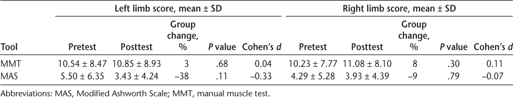There was no significant increase or decrease in muscle strength or spasticity in either lower limb as indicated by manual muscle test (left P = .68, right P = .30) and MAS (left P = .11, right P = .79) scores (Table 4). Ten of 14 participants (71%) demonstrated a nonsignificant decrease in the total Modified Fatigue Impact Scale (fatigue) scores from 30.79 ± 12.97 to 25.43 ± 14.11 (P = .07). However, there was a significant decrease in the Physical (P = .02) and Psychosocial (P < .01) subscales of the Modified Fatigue Impact Scale (Table 5). The magnitude of this change ranged from small to large (Cohen's d = 0.31–0.74), with the largest effect size for the Psychosocial subscale (Cohen's d = 0.74).