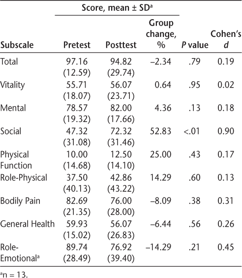 The only significant and meaningful change in the SF-36 was in the Social subscale (P < .01; Cohen's d = 0.90), and 11 participants (79%) demonstrated an improvement in this subscale score (Table 6).