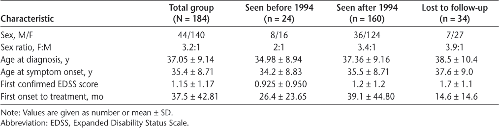The 184 patients studied (age > 18 years) had a mean ± SD age at symptom onset of 35.4 ± 8.7 years; 140 were women and 44 were men (Table 1). Diagnosis was at a mean ± SD age of 37.05 ± 9.1 years. Mean ± SD follow-up from onset of symptoms was 13.7 ± 4.3 years, with 147 of 184 patients (80.0%) still being actively followed up at the time of the medical record review. Patients lost to follow-up were followed up for a mean ± SD of 11.6 ± 2.1 years from onset and were similar demographically to the entire group in age, sex, initial EDSS score, and time to first treatment. Most patients (140 of 184 [76%]) were examined at least yearly from diagnosis until 10 or more years after the onset of symptoms by a single examiner who rated EDSS score. A smaller percentage of patients, 86 of 184 (47%), completed EDSS measurements through 15 years or more after onset. Mean time from symptom onset until diagnosis was 2.3 years. Initial events were often retrospectively recalled by patients at the time of their first visit to a neurologist.