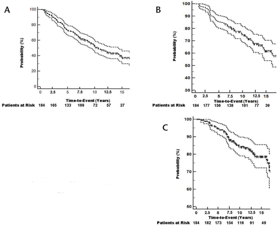 Kaplan-Meier time-to-event analyses (15 years). Time to Expanded Disability Status Scale scores of 3.0 (A), 4.0 (B), and 6.0 (C) in the 184 study participants