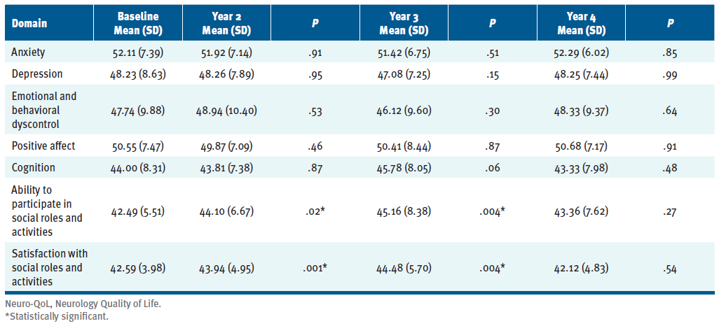 Scores in the Ability to Participate in Social Roles and Activities and Satisfaction with Social Roles and Activities domains of the Neuro-QoL had statistically significant improvement at years 2 and 3. As with the MSSE-10, statistically significant changes were not maintained at year 4. Mean scores at baseline and years 2, 3, and 4 P values are included in TABLE S1. Scores on other domains of the Neuro-QoL did not show statistical significance at any point during the 4-year period. Cognition in year 3 approached significance (P = .06).