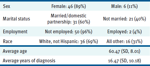 Data were collected from 119 people with MS who participated in the MSAC's day wellness programs from 2017 to 2021. Of the 119 individuals, data analysis was limited to 52 individuals for whom all 4 years of data were available. At baseline, the average length of MSAC participation was 16 months since some participated in MSAC programs prior to initial data collection in 2017. TABLE 1 reflects the baseline demographic characteristics of those individuals.