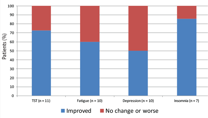 Overall, participants reported improvement across all domains (Figure 1). Select individuals reported improvement regarding some symptoms, but with no change in or worsening of others. For example, despite a reduction in the severity of insomnia and depression, one individual reported a worsening of fatigue. Another reported a reduction in fatigue but worsening of depression and an increase in TST. According to this medical record review, no adverse incidents or adverse effects were reported as a result of participation in CBT-I.