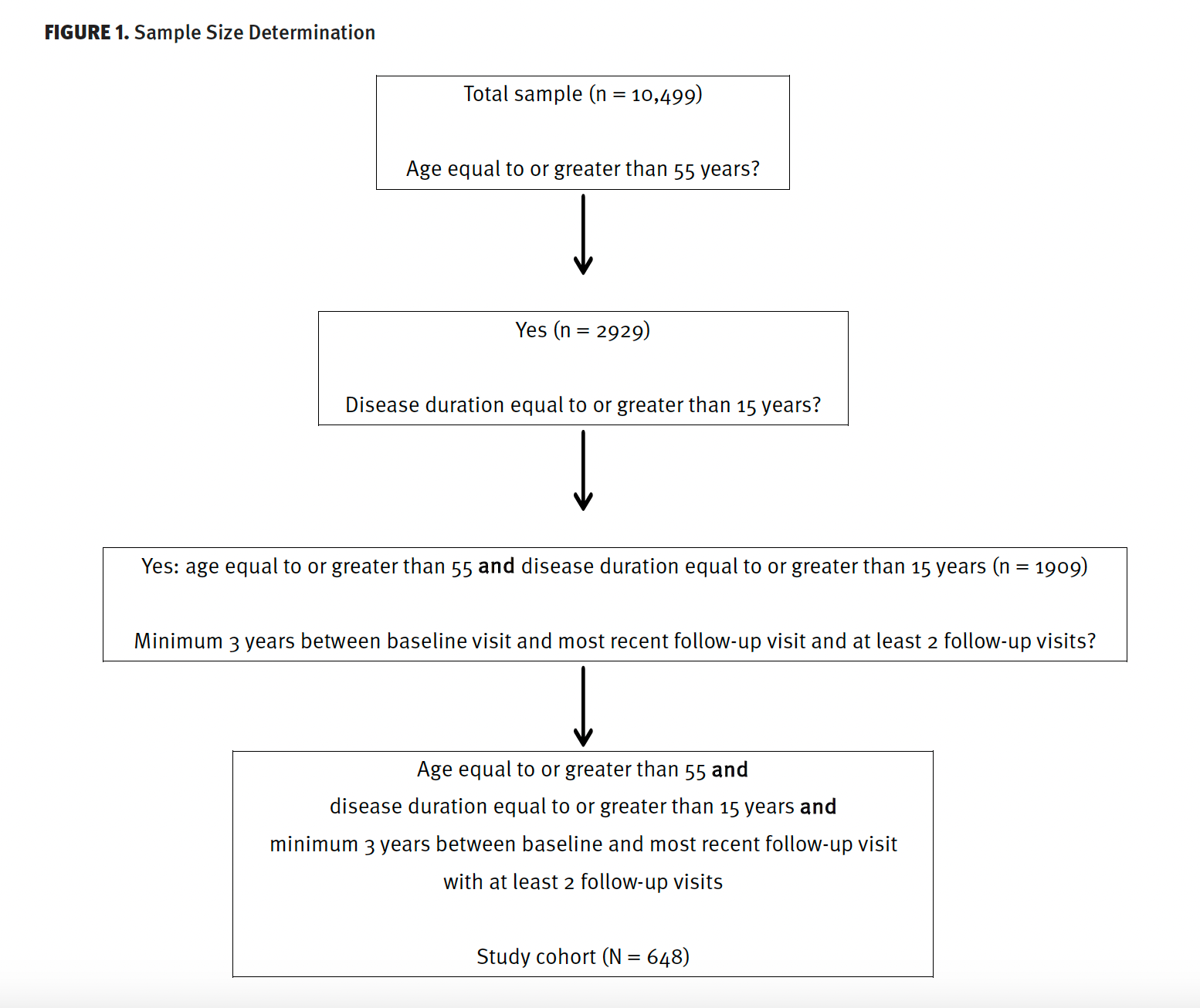 Figure 1 demonstrates the determination of the sample size and eligibility criteria for this analysis. To be included, people with MS were required to be 55 years or older, have a disease duration of at least 15 years, and have a minimum of 3 years between their baseline visit and most recent follow-up visit. The baseline visit was defined as the visit closest to when the participant turned 55 years old. The most recent follow-up visit available, at least 3 years after the baseline visit, was used for comparison. Of the 10,449 records in the database, 1909 were for people with MS who were 55 years or older and had a disease duration of more than 15 years. Of these 1909 people, 648 met the requirement of at least 2 follow-up visits with more than 3 years between them. All were diagnosed based on the current McDonald criteria at their time of enrollment.15 As part of the clinical visits, which were recorded in the NYSMSC database, all participants underwent a thorough clinical examination by a NeuroStatus-certified investigator, and their degree of disability was quantified using the Expanded Disability Status Scale (EDSS).16 In our study, the criteria utilized to indicate increasing disability are based on criteria that are widely and routinely used in all MS clinical trials. In particular, this includes an increasing EDSS score that was defined as follows: (1) EDSS increase of 1.5 or more EDSS points if baseline EDSS was 0, (2) EDSS increase of 1.0 or more points if baseline EDSS was 1.0 to 5.0 points, and (3) EDSS increase of 0.5 or more points if baseline EDSS was 5.5 or more points. Disability improvement followed the same criteria but in the opposite direction (decreasing EDSS scores over the follow-up period). Stable disability was defined as EDSS changes lower than these thresholds in either direction. Due to the small number of people with disability improvement, they were grouped with people with stable disability. An additional measure of disability was the Timed 25-Foot Walk (T25-FW) test.17 Based on the medical history and clinical examination, all participants with MS were assigned phenotypes using the 2013 Lublin criteria.18 Clinical visits due to acute disease progression (relapse) are not included in the NYSMSC database, and all visits took place during a state of stable disability. The NYSMSC project is approved by the institutional review board at the University at Buffalo, and all participants provided written consent.