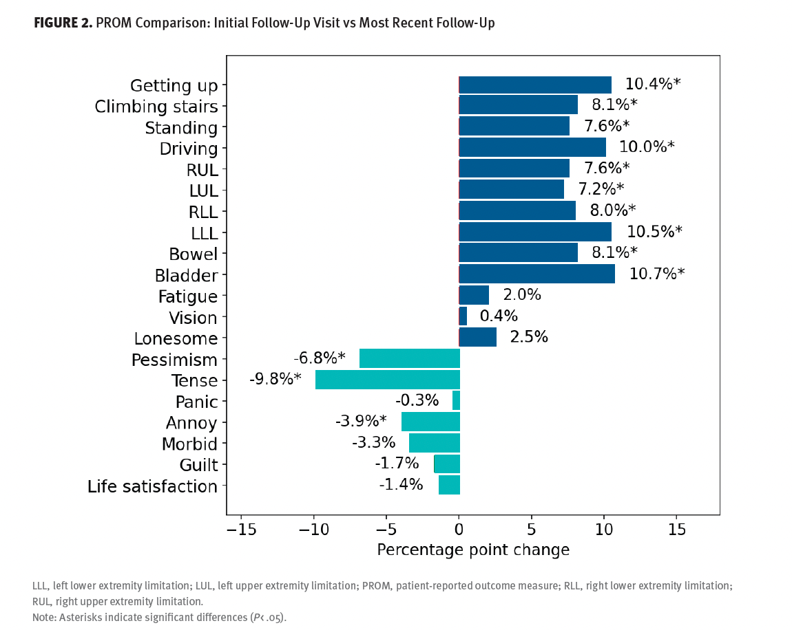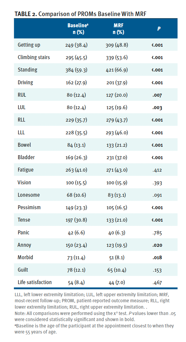 On the contrary, most of the PROM psychosocial domains significantly improved. Significantly fewer participants reported severe/a lot of limitations with regard to pessimism (23.3% vs 16.5%, P < .001), feeling tense (30.8% vs 21.0%, P < .001), feeling annoyed (23.4% vs 19.5%, P = .02), and having morbid thoughts (11.4% vs 8.1%, P = .018) at their follow-up appointment.