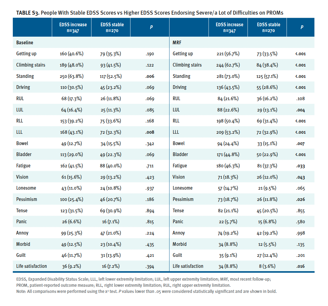 Importantly, despite their equivocal EDSS scores at baseline, people who had higher EDSS scores over the follow-up period reported significantly greater physical limitations at their baseline visit when compared with those with stable EDSS scores, including severe/a lot of limitations in their ability to stand for more than 30 minutes (63.8% vs 52.5%, P = .006) and severe limitations in their left lower extremity (43.1% vs 32.3%. P = .008) when compared with the people with stable EDSS scores at follow-up.