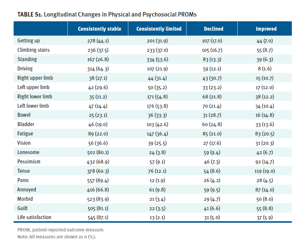 The changes in PROMs are shown in Table 2 and Figure 2. There was a significant increase in the percentage of people reporting severe/a lot of difficulties within the physical domain of the questionnaire, particularly regarding limitations in getting up from a low seat (38.4% vs 48.8%, P < .001), climbing a flight of stairs (45.5% vs 53.6%, P < .001), standing more than 30 minutes (59.3% vs 66.9%, P < .001), driving (27.9% vs 37.9%, P < .001), limitations in all extremities (P < .007), and bladder and bowel control (26.3% vs 37% and 13.1% vs 21.2%, respectively; both P < .001).