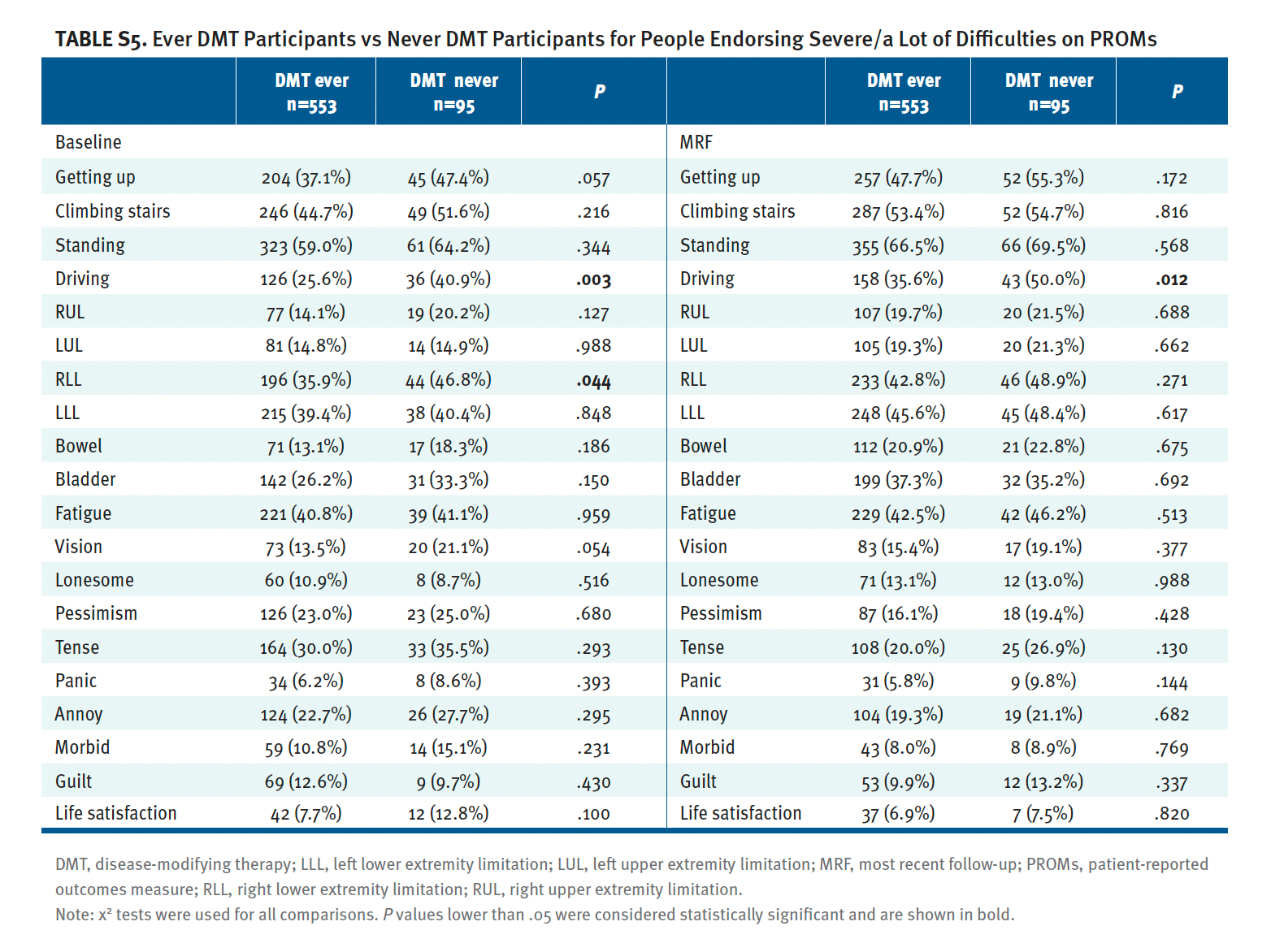 The long-term categorical differentiation of PROMs between the aforementioned groups is also shown in Table S5. Overall, a significantly greater percentage of people with MS who had never used a DMT had severe/a lot of difficulties in driving (40.9% vs 25.6%, P = .003) and their right lower extremities (46.8% vs 35.9%, P = .044) when compared with people with MS who were treated with DMTs. Similar findings were seen at the most recent follow-up visit, where significantly more people not treated with DMTs were not able to drive (P = .012).