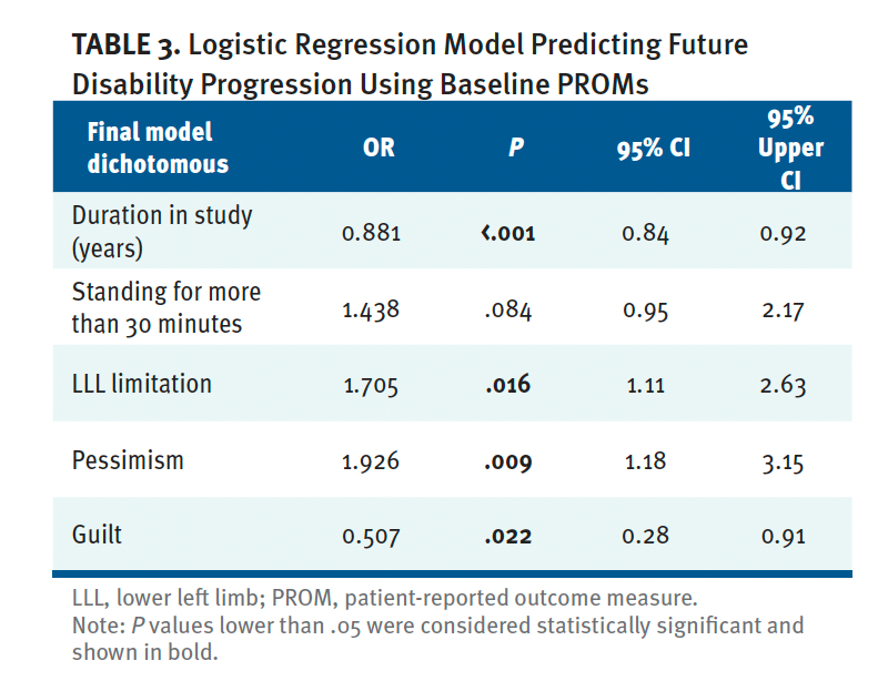 The predictive values of baseline PROMs to determine future disability progression are shown in Table 3. Severe limitations in the lower extremity (OR = 1.705, P = .016) and greater pessimism (OR = 1.926, P = .009) at baseline were both predictive of disability progression over the follow-up period. However, people reporting greater guilt (OR = 0.507, P = .022) had a lower risk of disability progression at follow-up.