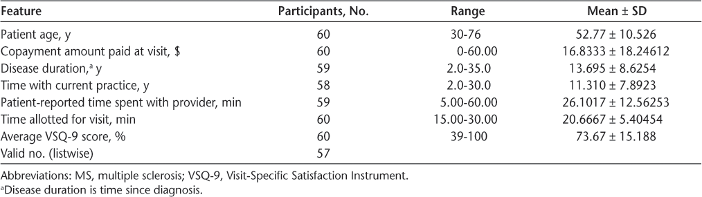 This is a cross-sectional pilot study wherein a convenience sample was recruited from two MS centers. Demographic data were collected previsit, and satisfaction surveys were completed postvisit using the Patient Satisfaction Questionnaire Short Form (PSQ-18) and the Visit-Specific Satisfaction Instrument (VSQ-9). Different attributes of satisfaction and visit times were analyzed.