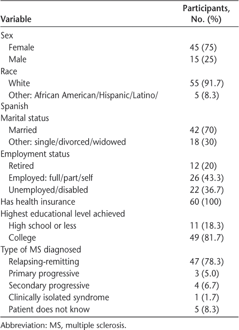 Clinical attributes were also recoded. Type of MS was categorized into progressive type, which included primary and secondary progressive types (n = 7 [11.7%]), and nonprogressive type, which consisted of relapsing-remitting variety and clinically isolated syndrome (n = 48 [80.0%]). Five patients (8.3%) reported that they did not know their disease type and, therefore, could not be categorized. Disease duration (time since diagnosis) ranged from 2 to 35 years. Time with the current practice ranged from 2 to 30 years (Table 2).