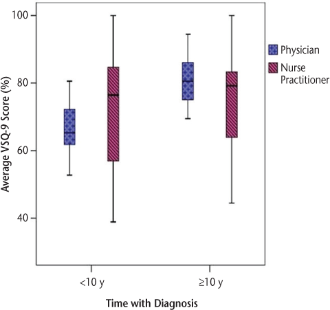 Average Visit-Specific Satisfaction Instrument (VSQ-9) scores compared by disease duration