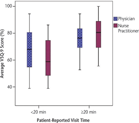 Average Visit-Specific Satisfaction Instrument (VSQ-9) scores compared by patient-reported time in visit