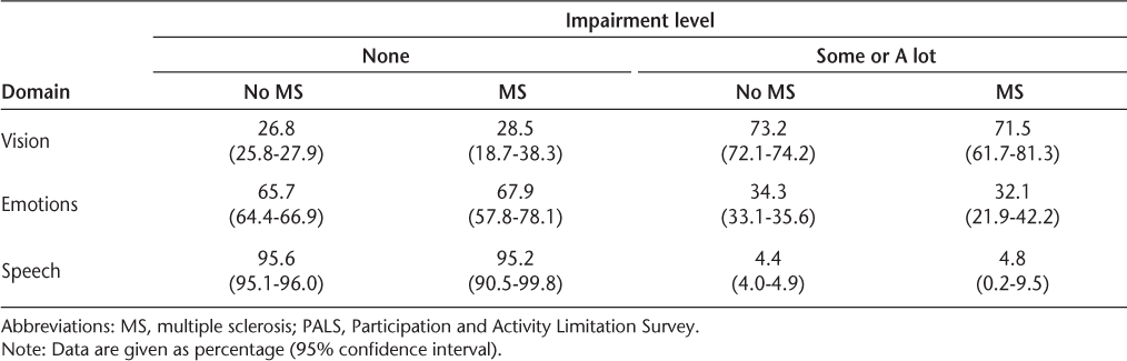 Health-related impairments in the PALS sample by MS status: vision, emotions, speech