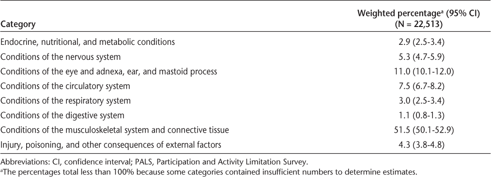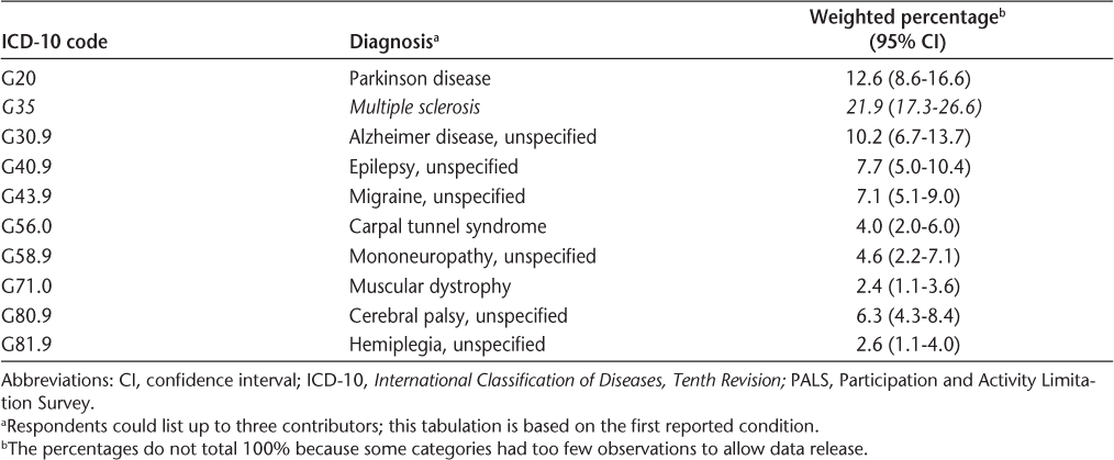The percentages of PALS participants reporting various disabling conditions are reported in Table 1. The most common category of conditions was musculoskeletal. A total of 5.3% of the sample reported that their impairments were caused by a neurologic condition; the categories of such neurologic conditions are shown in Table 2. Among respondents with neurologic conditions, MS was among the most common conditions reported.