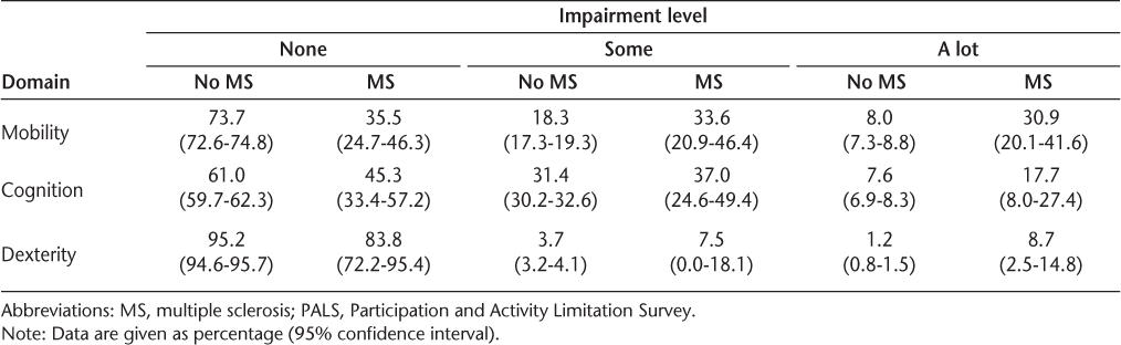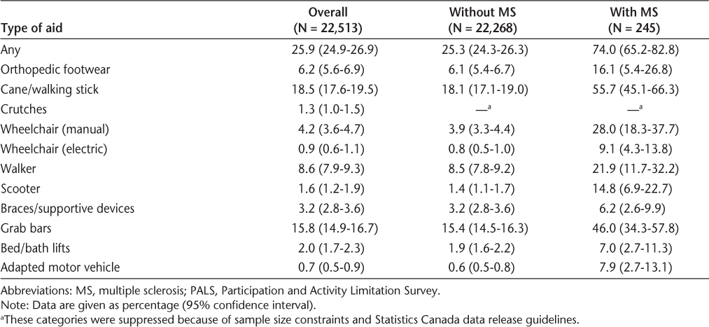 An opportunity to examine health status, care needs, and unmet needs in a community sample with MS arises from a Canadian post-census survey called the Participation and Activity Limitation Survey (PALS).6 This survey is based on a probability sample of respondents reporting health-related impairments during a national census conducted in 2006. Conditions responsible for impairment were recorded in the data set, allowing disease-specific analysis. The survey's linkages to a national census allow some population-based inferences to be made. In this analysis, we were interested in examining health status, the use of aids and supports, perceived unmet needs, and participation in society by people with MS in Canada.