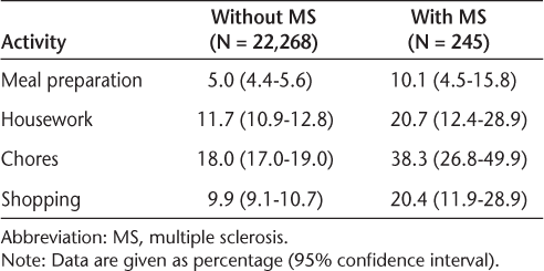 Leisure activity is an aspect of participation in society. Of those activities evaluated in the PALS, the participation percentages were generally similar between those with MS and the rest of the PALS sample. Exercising at home at least once per week was reported by a higher proportion of those with MS (57.1%; 95% confidence interval [CI], 41.9%–72.2%) than without MS (44.5%; 95% CI, 42.7%–46.2%), but imprecision associated with the MS estimate precludes statistical differentiation from the non-MS component of the sample. Watching television or listening to music was reported as a daily activity by 94.8% (95% CI, 91.3%–98.2%) of those with MS and 91.3% (95% CI, 90.6%–92.0%) of those without MS. Reading was less often a daily activity for people with MS, being reported by 62.9% (95% CI, 51.0%–74.7%), as compared with 76.1% of those without MS (95% CI, 74.9%–77.4%). Participation in activities outside of the home was also comparable between people with MS and those with other types of disability. Of those with MS, 53.7% (95% CI, 41.2%–66.2%) reported visiting with family or friends at least once per week, compared with 48.8% (95% CI, 47.4%–50.1%) of those with other types of disability. Participation in physical activities outside of the home at least once per week was reported by 39.7% (95% CI, 22.6%–56.9%) of those with MS, compared with 45.3% (95% CI, 43.8%–46.9%) of those without MS. In both groups, 40% to 50% reported attending sporting or cultural events or visiting museums, libraries, or parks. Only 4.5% (95% CI, 1.3%–7.7%) reported no participation in society in any of the above-listed domains of participation.
