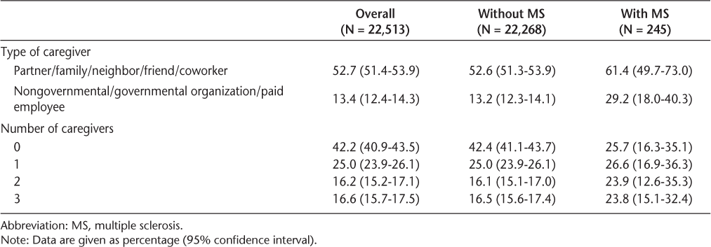 Table 6 presents the types and number of caregivers identified by PALS respondents with and without MS. The people with MS were more likely to have one or more caregivers and to identify multiple caregivers. Similar proportions of people with and without MS identified family or friend caregivers, but those with MS were far more likely to report having a paid caregiver.