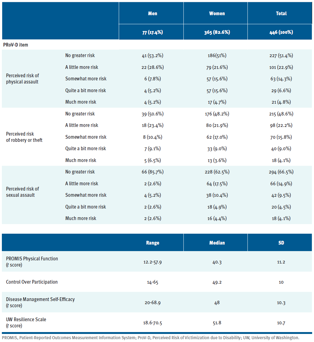 Living with a cognitive or physical disability can affect a person's sense of personal safety, contributing to an increased fear of interpersonal victimization (eg, physical/sexual assault, theft, etc).1,2 Increased perception of crime can follow in the wake of personal victimization, witnessing a crime, or even hearing about a crime in the community.3,4 Fear of victimization may also be related to age and sex, with some previous research suggesting that women, older adults, and young adults fear interpersonal victimization at higher rates than men and middle-aged adults.5 ,6 While men are generally more likely to be the target of crimes than women, women with disability are more likely to be targeted than men with disability.7,8 Fear of victimization can lead to restrictions in community participation, as individuals may (for example) avoid strangers, restrict social activities, or avoid activities at night. These behaviors can lead to social isolation and poorer quality of life.6
