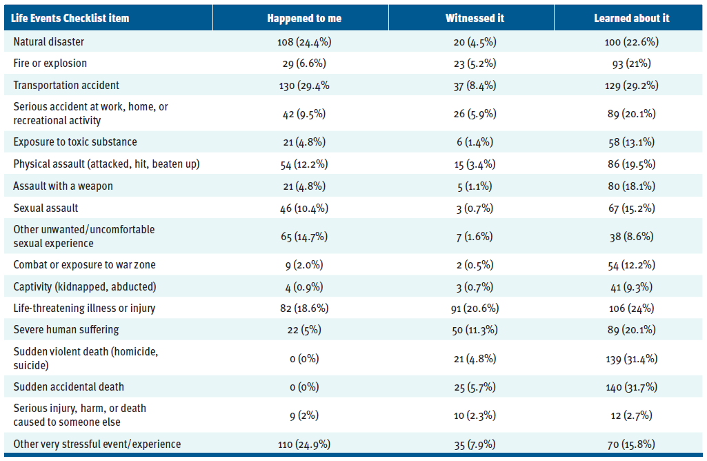 Weis CN, Webb EK, Stevens SK, Larson CL, deRoon-Cassini TA. Scoring the Life Events Checklist: comparison of three scoring methods. Psychol Trauma. 2022;14(4):714-720. doi: 10.1037/tra0001049