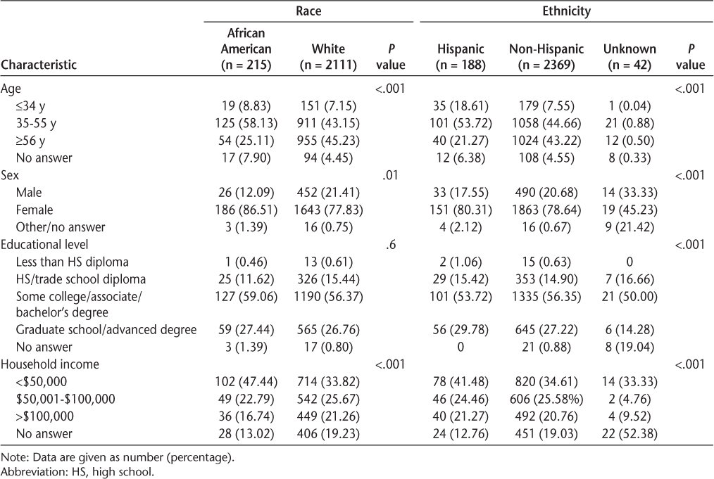 Demographic (Table 1) and MS-specific (Table S1) characteristics were compared between self-reported racial and ethnic groups using nonparametric tests. Of the total participants in the study, 7.23% were Hispanic; 8.27% were African American; 92.89% were residents of the United States, with the remainder from 40 other countries; 78.62% were women; 20.77% were men; and 39.57% of the total had participated in research studies previously.