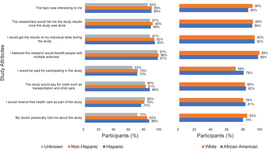 We found that the preferred MS research participation characteristics across racial and ethnic groups are similar to previously published data in other areas of medicine. A systematic review reported that perceived lack of access to information is a health barrier to health research participation among racial/ethnic groups, including the absence of bilingual informational material and research staff.25 Effective communication positively influences the decision to participate in clinical trials in minorities.24 Unintended outcomes, such as harm due to study participation and adverse effects from the intervention under investigation, have also been reported to be barriers for research participation in minorities.25 Similar to research in other areas of medicine, we found that altruism (research participation benefiting others in the community), low risk in participation, and individual benefits to participation (such as receiving individual test results) are incentives or facilitators to participate in MS research across racial and ethnic groups.25