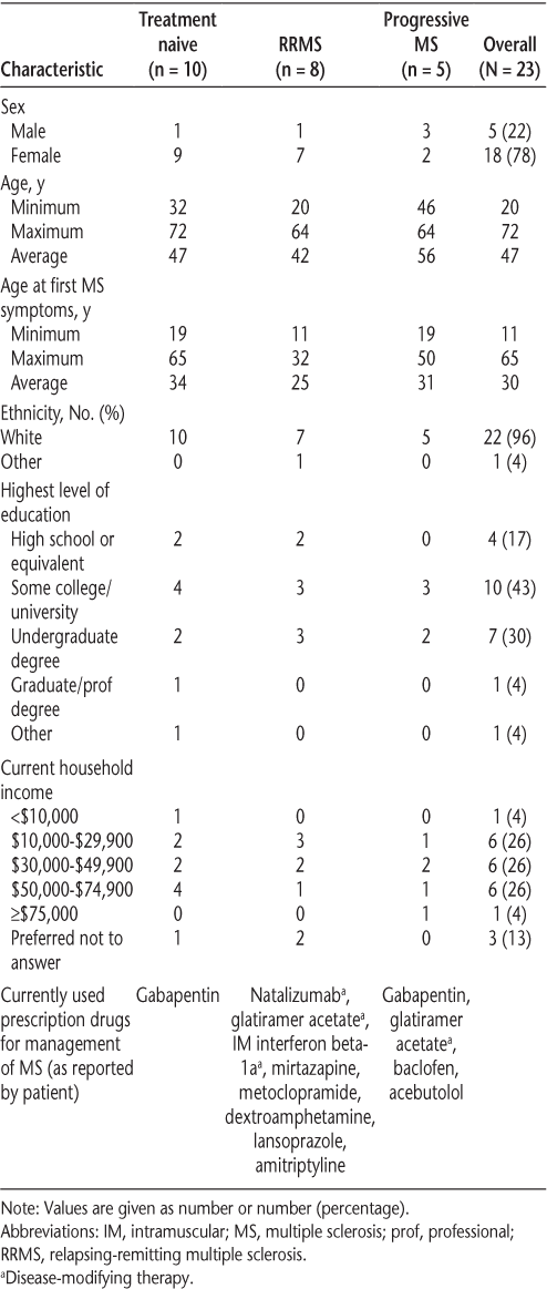 Focus groups were conducted in Vancouver, Canada, with 23 adult patients with MS. Participants were interviewed in three groups based on disease category and MS treatment experience: treatment-naive, non–treatment-naive relapsing-remitting and non–treatment-naive progressive MS.