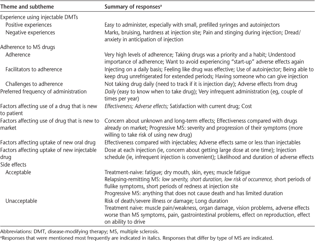 In this focus group study, potential effectiveness and side effects (eg, severity, duration, and likelihood of occurrence) of MS drugs emerged as the most important attributes to the patients with MS. In general, of those who were using an injectable therapy, participants did not find it difficult to use injectable drugs and were not willing to sacrifice the potential benefits or the stability of their current injectable therapies or to take on an increased risk of side effects for the sake of greater convenience in route or frequency of administration. Although some participants found the possibility of receiving injections twice yearly appealing, there were concerns about potential side effects and the impact of future therapy. Many participants stated that they prefer daily administration because it allows use of the medication to become routine and eliminates concern about losing track of when the drug needs to be taken. Adherence to injectable drugs, as well as overall satisfaction with the drugs, was enhanced with the ability to keep the medication unrefrigerated for extended periods and the availability of prefilled autoinjectors. Although participants did identify side effects from their current drugs, those using MS drugs generally felt that they were getting a benefit from their medication that made it worth enduring the side effects they were experiencing. However, there was dissatisfaction with the generally low level of effectiveness of MS drugs.