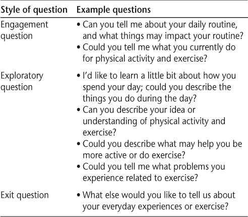 We conducted the interviews in a quiet office using a standardized semistructured interview schedule. The formal interview questions were based on the qualitative literature on social participation, everyday experiences, lifestyle behavior, and physical activity and exercise in MS. Interview questions included engagement questions, exploratory questions, and exit questions (Table 1). The responses to these standard questions were explored further for clarification and depth of inquiry. The interviews lasted on average 45 minutes and always opened with the quantitative survey before moving into the areas of everyday experiences, physical activity, and exercise. Interviews were led by one researcher (IMR), with additional questions added by YCL. The participant was the primary interviewee, but five participants were accompanied by caregivers (family member or personal-care attendant), who provided some input during the interviews. All participants received $20 for their participation.