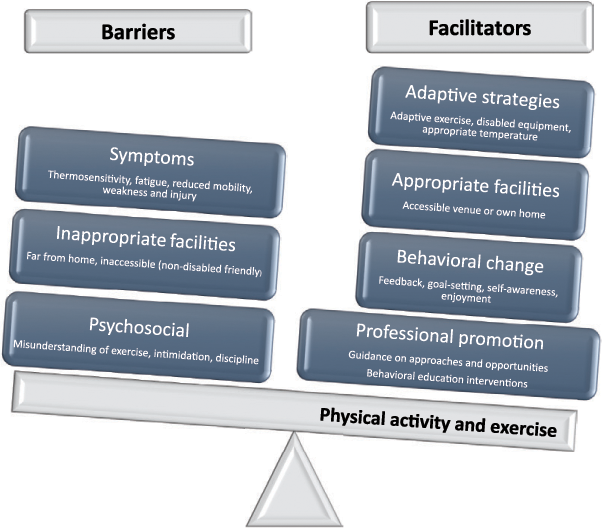 Our participants perceived similar barriers to exercise as others with MS,18 30 namely, MS symptoms, inaccessible environments, and negative personal beliefs about physical activity and exercise. Key facilitators of increased physical activity and exercise include adaptive strategies such as adapted physical activities and exercise performed in an accessible environment with an appropriate temperature. Interventions should also contain behavioral change components to encourage initiation and maintenance of lifestyle physical activity and exercise behaviors.