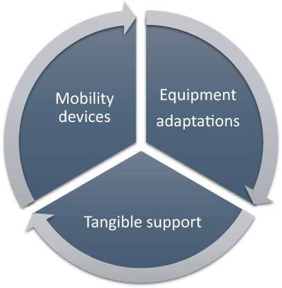 Maximizing Participation. Participants discussed ways in which they maximized participation in their home, in the community, and while undertaking social activities. Specifically, a triad of strategies was discussed (Figure 1). Participants owned different mobility devices (eg, canes, walker, wheelchair or powered wheelchair), used equipment adaptations (ie, home adaptations, home assistive devices, transport alterations), or accessed tangible support (eg, caregiver assistance for cooking, cleaning, or transport) to maximize physical activity participation. The participants were all wheelchair users, and many owned multiple mobility devices that were required to combat disability progression, symptom changes, and environmental hurdles: “I choose my mobility device based on space and energy. Inside my small house I use my walker, or sometimes I have to use forearm crutches in narrow doorways. Everything needs to be planned out, I don't have room for my manual chair, so I leave it in the car. I need my wife's help if I need that. Then if I go any great distance outside I need my powered chair” (Participant 4).