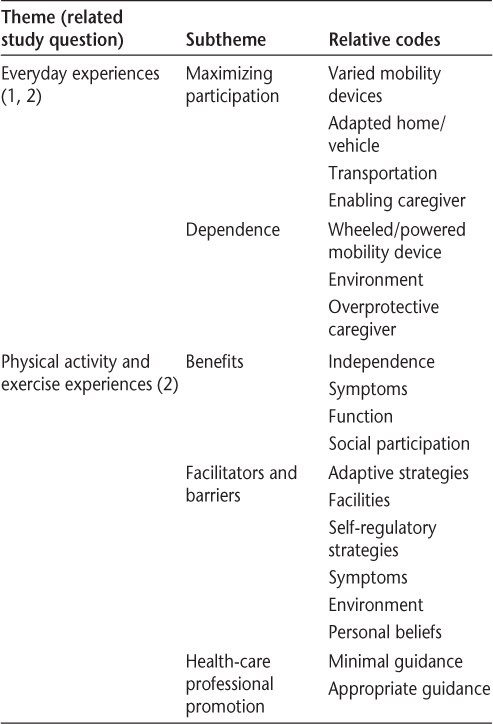 The recorded interviews were transcribed verbatim and read multiple times by the two interviewing researchers (YCL and IMR) and analyzed based on standard guidelines.24 We began analyzing our data concurrently as new interviews were occurring. Using open coding, we analyzed one interview to develop themes, then put the findings aside before analyzing the next. This process was repeated for the first ten interviews. To do this, each researcher independently coded the transcriptions line by line and created notes/topic areas from each interview. The researchers then met and discussed topic areas to generate key themes, with 26 different codes initially emerging from the interviews. We then created a coding frame from these 26 codes, and the final five interviews were processed using this coding frame; the original ten interviews were reanalyzed using the coding frame. This permitted both inductive (data-driven) and deductive (concept-driven) analysis of the data. The 26 codes were then further refined and renamed to 18 codes of direct relevance to the research questions. Five subthemes emerged from these codes, which yielded two overall themes. This article reports on the findings related to 1) everyday experiences of people with MS who were wheelchair users and 2) participants' views and experiences related to physical activity and exercise.