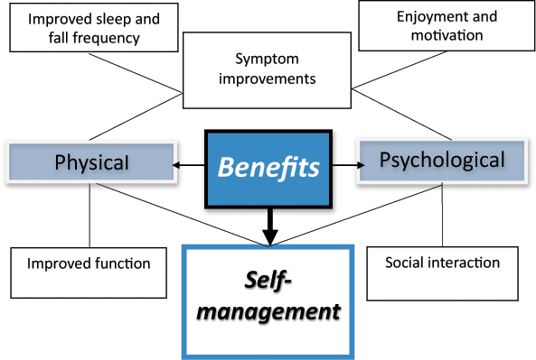 In these past studies, the facilitators that were identified included accessibility of facilities, appropriate professional support and self-regulatory strategies (eg, self-efficacy, goal-setting, and self-monitoring), social physical activity or exercise, and physical activity or exercise appropriate to one's capabilities. Perceived barriers to physical activity and exercise included disease-specific obstacles (eg, weakness, fatigue, heat sensitivity, medication side effects), personal beliefs (eg, fear and lack of time and money), and lack of professional promotion or inaccessible facilities.12–18 The perceived benefits of exercise in those with MS have included symptom and functional improvement, and improvement in areas related to psychosocial factors (eg, enjoyment of life and social participation).12–18 Empowerment and control are important benefits that have been acknowledged across the disability spectrum in MS,13 14 16–20 particularly as they can lead to feelings of self-management in relation to physical activity.