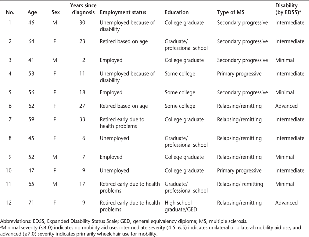 Potential participants were identified through involvement in previous research studies and through the Greater Washington chapter of the National Multiple Sclerosis Society (NMSS), which serves 23 counties in Washington. Recruitment was done through invitation letters, advertisements in the organization's newsletter, self-help groups, and the NMSS website. We used special case purposive sampling,12 in which we intentionally oversampled people with moderate disability (no less than 2 years since diagnosis and minimal or intermediate disability on the Expanded Disability Status Scale [EDSS]) who potentially could be users of or benefit from self-management. Eligible participants were aged 18 years or older, with physician-diagnosed MS and the ability to travel to the University of Washington without financial or logistical support. Individuals received payment of $25 for their participation. We recruited consecutive responders. Twenty people were scheduled for two focus groups, and 12 people participated: 5 in the first group and 7 in the second. (Travel difficulty or illness prevented attendance for some people originally scheduled to participate.) Demographic information about participants is shown in Table 1. The group composition is typical of the larger MS population: mostly women (67%), aged from 41 to 71 years, most with at least a college education (67%). All recruiting and focus group methods were approved by the University of Washington Human Subjects Review Committee.
