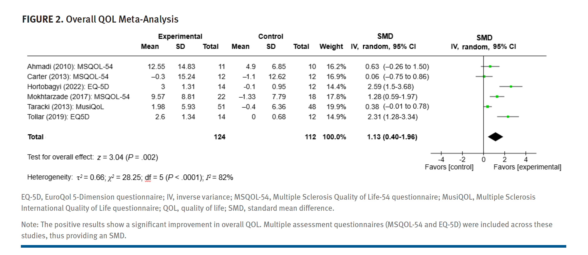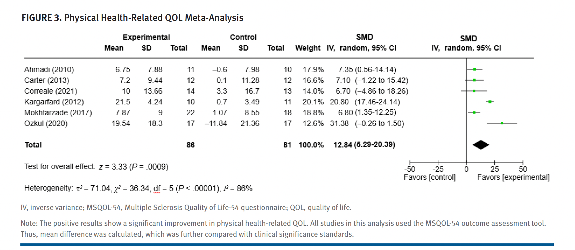 Meta-analyses were performed following Cochrane guidelines.12 Studies were excluded from the meta-analysis if they did not include a control who did not meet PAG-MS. If a study contained multiple intervention groups, only one was included, in accordance with Cochrane recommendations.12 Researchers analyzed overall QOL as well as physical and mental health–related QOL subscales. These separate analyses were performed because the MSQOL-54 only provides these subscales without an overall score.3 Only studies using MSQOL-54 were used to assess clinical significance, as MCID requires a singular outcome measure for analysis. All analyses and funnel plots were completed on the Review Manager online (Cochrane). Differences in mean change between groups were computed using the inverse variance model, and heterogeneity was estimated using I2.12 Researchers performed visual inspection for asymmetry on funnel plots. A formal asymmetry test (eg, Egger) was not performed due to the low number of studies, in accordance with the recommendations of the Cochrane guidelines.12