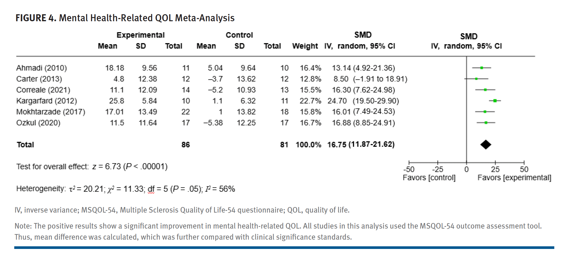 Eleven studies assessed mental health–related QOL.20,22-26,29,30,32,34,35 Six of these used the MSQOL-54 assessment tool and were included in a meta-analysis (Figure 4).20,25,26,29,32,35 The results of this comparison showed a statistically significant improvement in mental health–related QOL favoring the physical activity group (MD, 16.75; 95% CI, 11.9-21.59; P < .01; Bonferroni-adjusted P < .01; I2 = 56%). These results surpassed the clinical significance thresholds with an MCID of 11.35, which we estimated for MSQOL-54 mental health–related QOL. Of these 6 studies included in the meta-analysis, 100% were rated with a high concern of bias.20,25,26,29,32,35 An exploratory funnel plot for mental QOL did not show excessive asymmetry on visual inspection, with larger studies clustering closer to the pooled estimate. Due to the low number of studies, this funnel plot should be interpreted cautiously. A heat map summary of risk of bias scoring is available in Table S3.