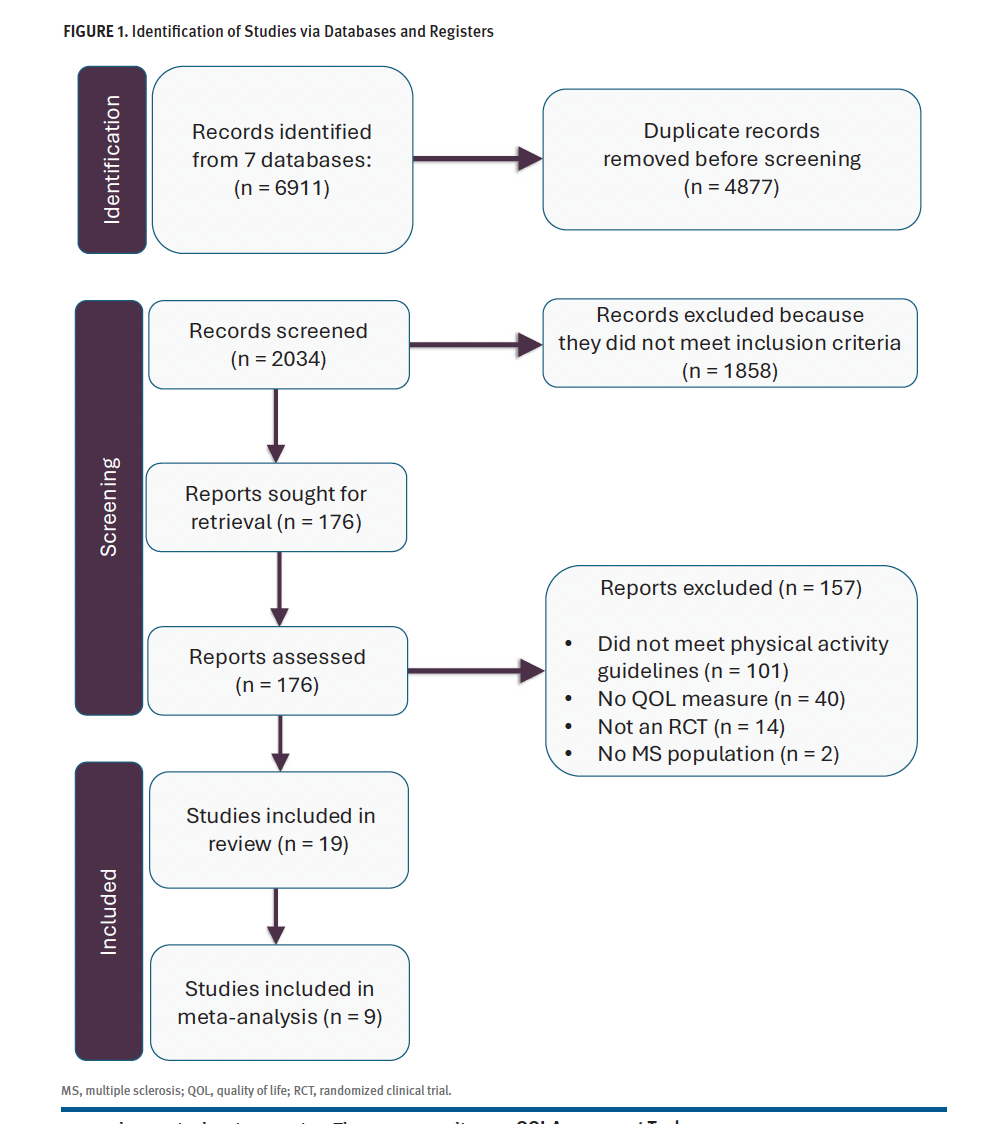 Study eligibility was determined based on the Population, Intervention or Exposure, Comparators, Outcomes, and Study designs framework. Its inclusion criteria were the following: (1) Population: adults with an MS diagnosis; (2) Intervention: physical activity that met PAG-MS criteria (≥ 150 min/wk of physical activity or biweekly sessions of 10-30 minutes of moderate-intensity aerobic exercise with 2 sessions of resistance training5,6); (3) Comparators: no intervention or an active control group that did not meet PAG-MS; (4) Outcomes: measures of QOL (eg, Multiple Sclerosis Quality of Life-54 [MSQOL-54], Multiple Sclerosis International Quality of Life [MusiQOL], and Health-Related Quality of Life [HRQOL]); (5) Study design: Only randomized controlled trials (RCTs) were included. Both intention-to-treat and per-protocol studies were considered for this review. Studies were excluded if they did not meet PAG-MS, were not RCTs, were feasibility or pilot studies, or were not published in English.