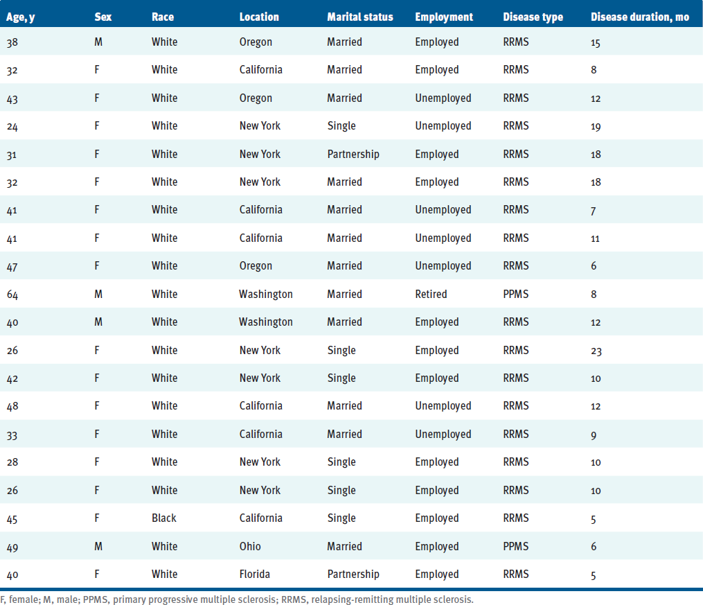 The recruitment process is presented in FIGURE S1. The study purposefully recruited participants who were (1) diagnosed with MS within the past 2 years and (2) 18 years or older. The study flyer was distributed by the National Multiple Sclerosis Society across the United States. Interested participants contacted the research staff via email. The participants were screened and interviewed until there was no new information or patterns acquired through the course of interviewing. Of 60 potential participants who contacted the research staff, 39 were screened for eligibility, 10 did not meet the study criteria (ie, diagnosed with MS for >2 years), and 9 individuals declined to participate. The final sample included 20 participants, 16 women and 4 men, who were IND-MS (TABLE 1). The mean ± SD age was 38.5 ± 9.8 years (range, 24-64 years). Most participants reported having relapsing-remitting MS (90%) with a mean ± SD disease duration of 11 ± 5.1 months (range, 5-23 months) and being ambulatory without or with assistance (ie, walking with a cane). Participants mainly identified as White (95%), married (60%), and employed (60%).