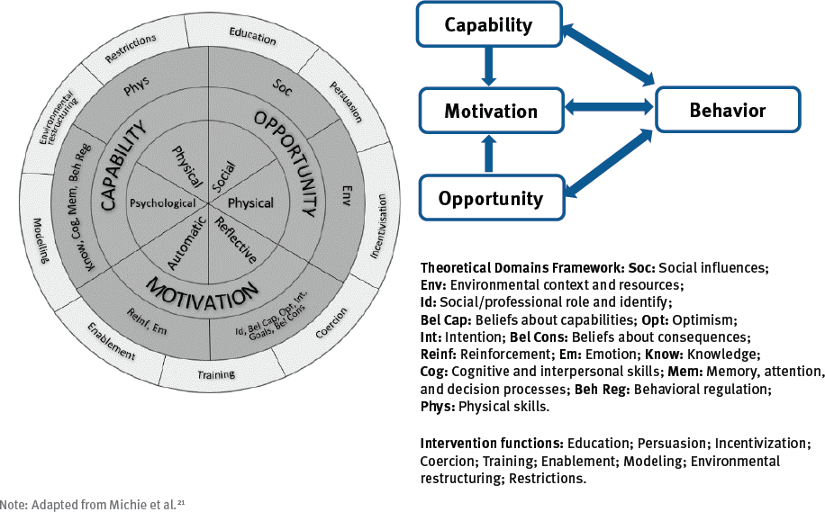 The Behavior Change Wheel (left), the Capability-Opportunity-Motivation-Behavior Model (top right), the Theoretical Domains Framework (middle right), and the Intervention Functions (bottom right)