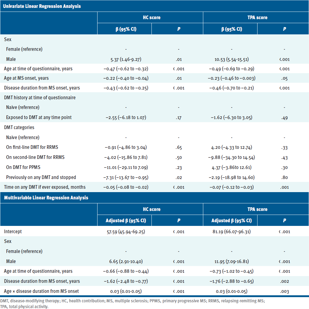 Longer time on DMT (if exposed to DMTs), female sex, older age at time of GLTEQ completion, older age at MS onset, and longer MS disease duration were significantly associated with lower (less active) TPA and HC scores on the univariate analysis (TABLE 2). There were no significant associations between those naive to DMT versus exposed to DMT with the TPA or HC scores (all P values > .05). The small number of participants on DMT for primary progressive MS (n = 5) and those who had discontinued MS drug treatment (n = 48) (Table 1) had lower TPA and HC scores compared with those who were treatment naive in the univariate analysis. However, in the multivariable analysis, none of the DMT independent variables remained significantly associated with physical activity levels (Table 2).