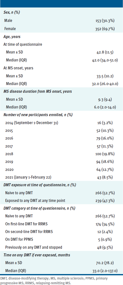 A total of 993 surveys were sent with a response rate of 50.8% (n = 505). Median MS disease duration was 6.0 years (IQR, 2.0-14.0; Table 1); 37.8% (n = 191) had an MS disease duration of less than 3 years. Men were older in general (44.4 years vs 42.1 years; P = .04) and older at MS onset (35.3 years vs 32.7 years, P = .01) than women. There were no differences in MS disease duration between the sexes (women: median duration = 7.0 years, IQR, 2.0-14.0 years; men: median duration = 5.0, IQR, 2.0-14.0 years; P = .54).