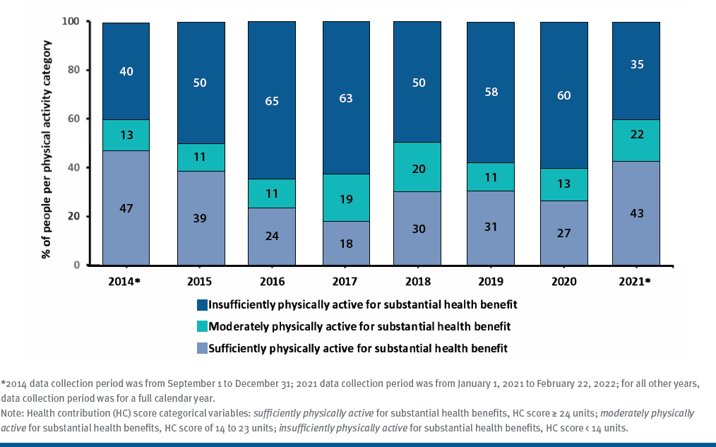 Over approximately 7 years, physical activity levels according the GLTEQ TPA or HC scores improved by a small, nonsignificant amount (FIGURE 1A, 1B). The TPA scores increased by 0.71 units per year (P = .26) and the HC scores increased by 0.61 units per year (P =. 21). There was no significant change over 7 years in the percentage of participants considered sufficiently, moderately, or insufficiently active for substantial health benefits over time (P = .07), despite the observed fluctuations (FIGURE 2).