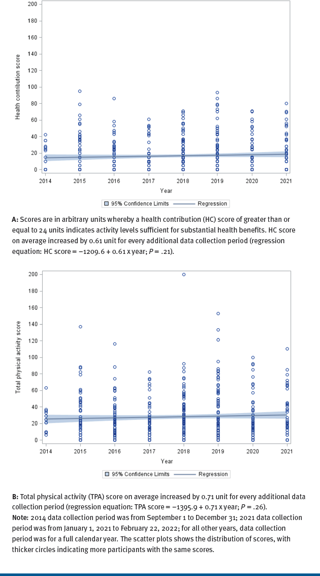 Survey response rate was the number of completed, returned questionnaires divided by the number of invitations sent. Descriptive analyses characterized the study population. The change in TPA and HC scores over time was explored using scatter plots with fitted linear regression. Since there were fewer than 8 weeks of data collection in 2022, those GLTEQ scores were plotted together with the 2021 calendar year data. Change in the percentage of participants annually who were sufficiently, moderately, or insufficiently active for substantial health benefits were examined using the χ2 test. Univariate, followed by multivariable, linear regression analyses examined the associations between independent variables (demographics and DMT history; TABLE 1) and TPA and HC scores. Variables significantly associated with TPA and HC scores in the univariate analysis (P < .05) were included in the multivariable regression model. Variables with P values less than .05 after a stepwise backward elimination were retained in the final multivariable regression model. Collinearity, confounding, and interaction effects among independent variables in the final multivariable model were also explored. Statistical tests were significant at a level of P values less than .05 (2-sided α = .05). SAS v9.4 software was used for data analysis.